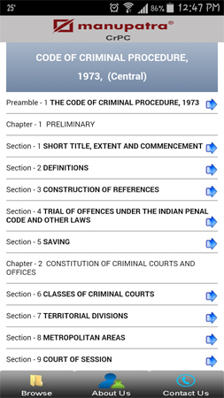 Complete Indian Code Of Criminal Procedure is available section wise which is quickly browsable. Just scroll through sections on your smart phone.