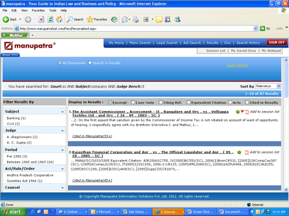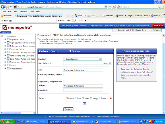 Result under the desired subject and Court will appear on screen with option to do free text search by selecting all or any/ few judgments.
