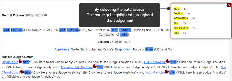 This feature enables the user to highlight the top 10 Keywords in a judgment, sorted on the number of times the word/s appear in the judgment. The word with maximum no of occurrence appears on the top.