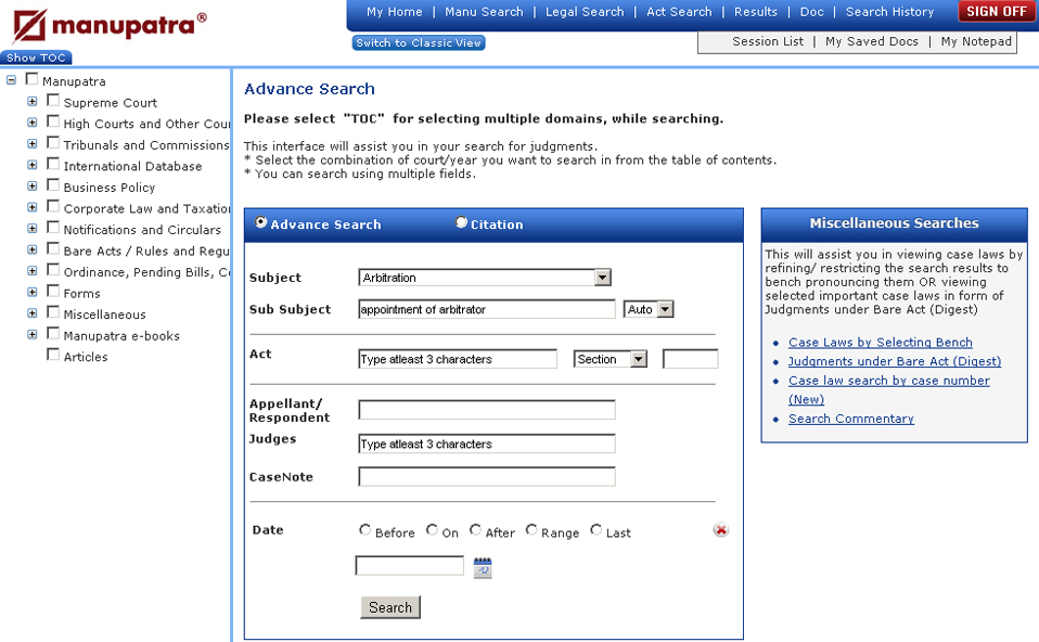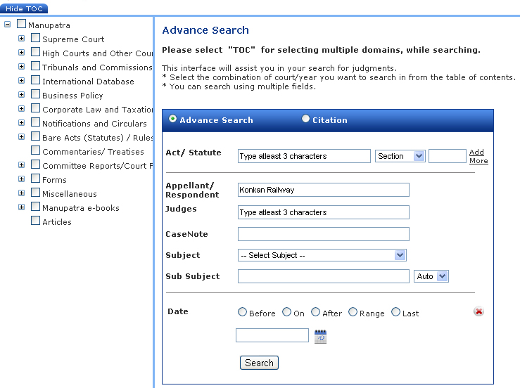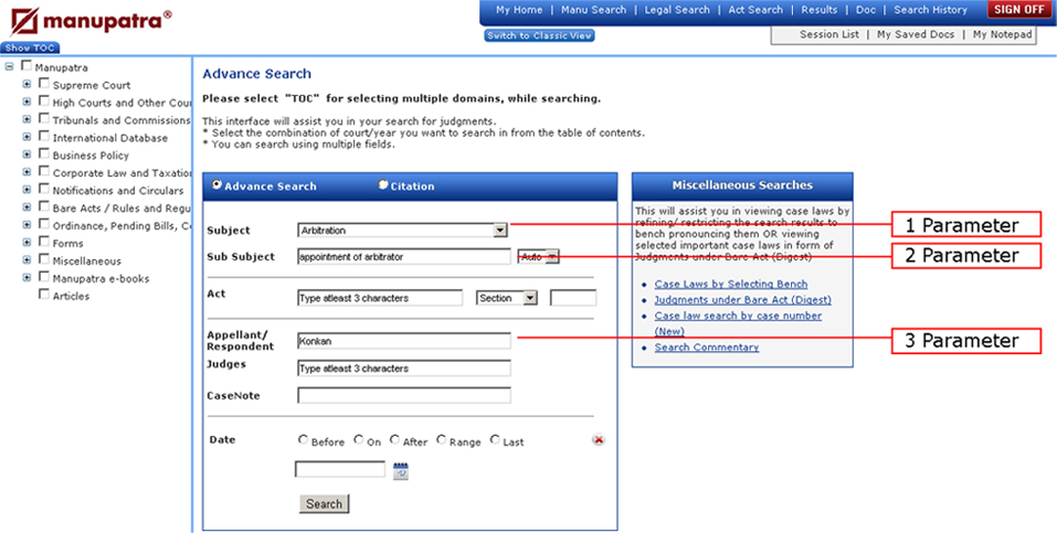 Note:The cases have been classified on various subjects by our team of competent editors. It may happen, the judgment you are looking under a particular subject may have been classified under a different subject.It is not mandatory to type sub-subject. Searching for cases by "Subject/Sub - Subject" plus one more parameter of Legal Search (Appellant or Judges) 1. Click Legal Search *Case Note Search allows you to restrict your search only to the Case Note of a judgment instead of the full text of judgment. This search is restricted to those judgments, which have Case Notes. Judgments, which do not have a point of law, do not have Case Notes. We add Case Notes for those cases which show some significance.